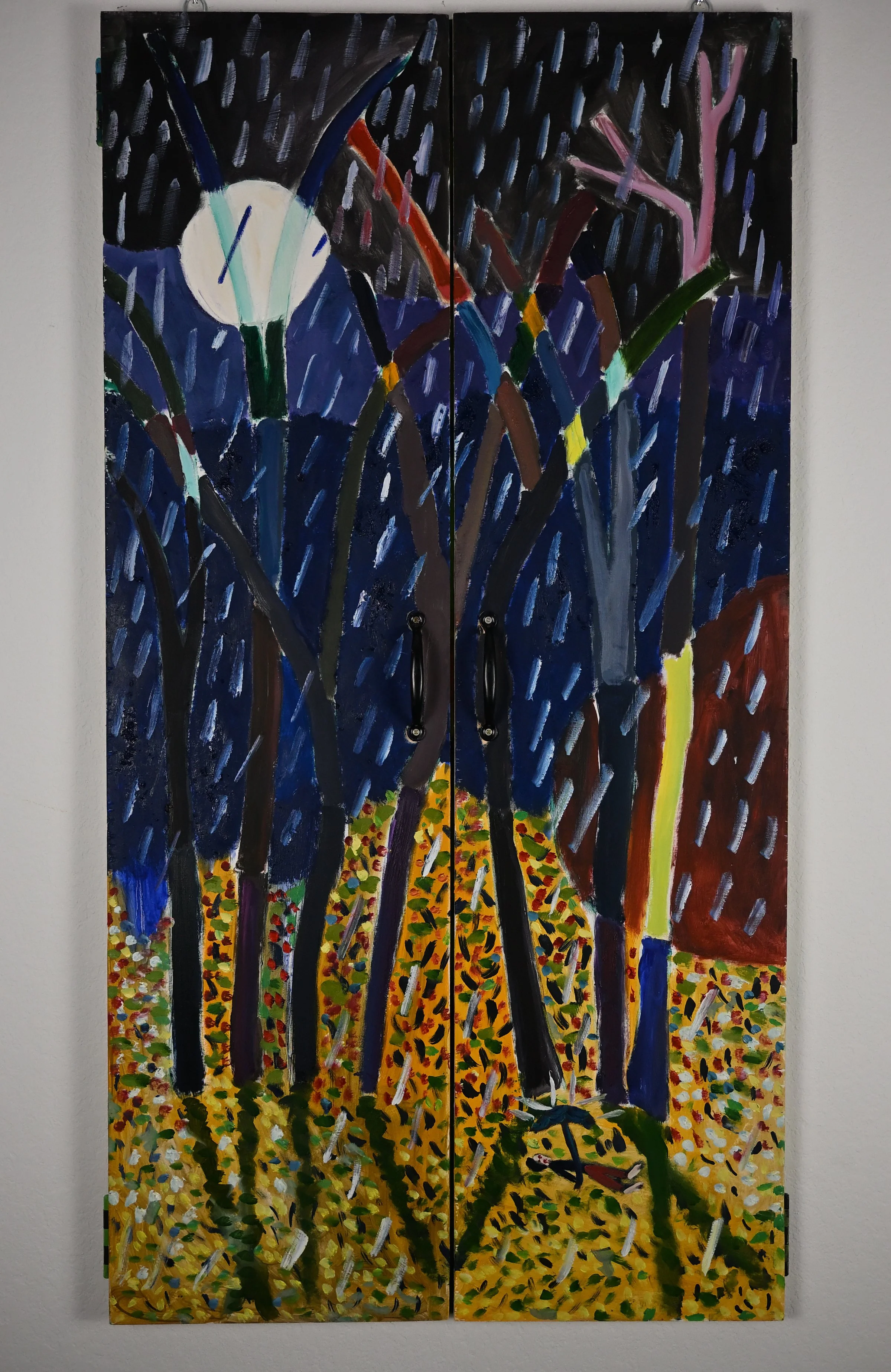 Karawane (outside), (Oil on artistmade door with wood panel, 48"x25", 2024).